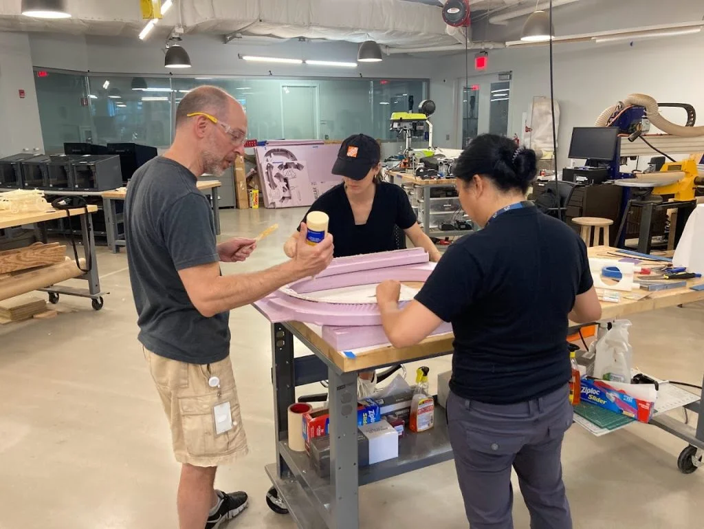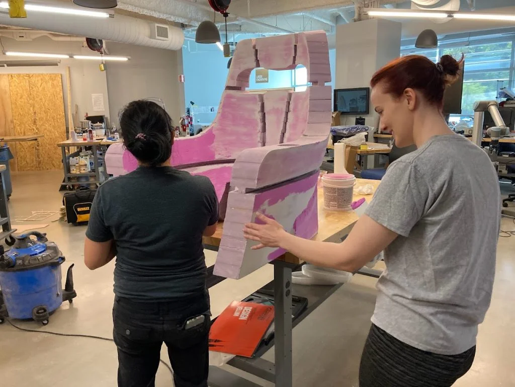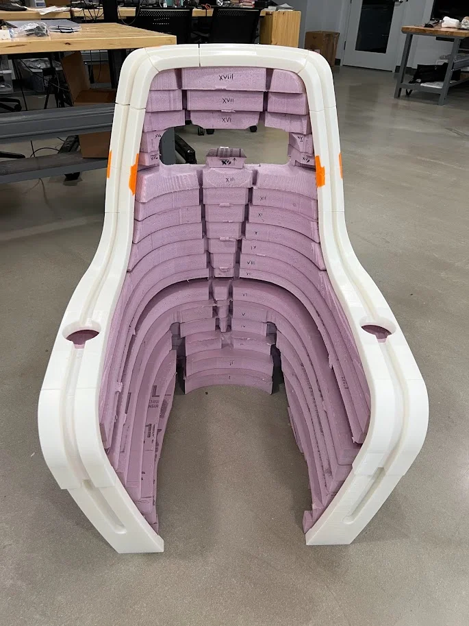 For 3D-printed pieces, Albert had to make sure everything was 6-7 cubic inches large so they could fit on the print beds. He had to redesign the 3D-printed pieces a few times; as all engineers know, while parts may look good in CAD, in real life, there can be complications. When some of the 3D-printed pieces, like the U-shape around the chair and the racing stripes, didn’t fit correctly, the team had to decide if they would fix it manually or redo the CAD and reprint. “Most of the time, it’s easier to change the CAD and reprint the part,” said Albert. And, so they did.
