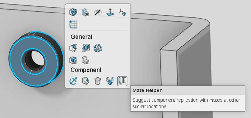 My number-one favorite new feature is the Design Assistant’s Mate Helper. The Design Assistant feature uses artificial intelligence (AI) and machine learning to help guide users and make suggestions to complete steps, based on your previous actions. Now the Mate Helper capability uses the same machine learning and AI capabilities to automatically insert additional instances of duplicate components like fasteners.