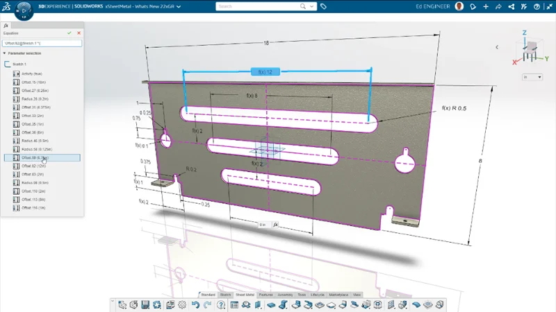 3D SheetMetal Creator now has equation capabilities for sketches and features. This new functionality utilizes the power of parametric modeling with the ability to create mathematical relationships between parameters to drive model geometry. It allows users to define dimensions and feature parameters based off equations and mathematical functions, creating relationships that enable rapid iterations and design changes.