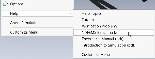 Select Simulation from the top menu bar. Select Help. Select NAFEMS Benchmarks.