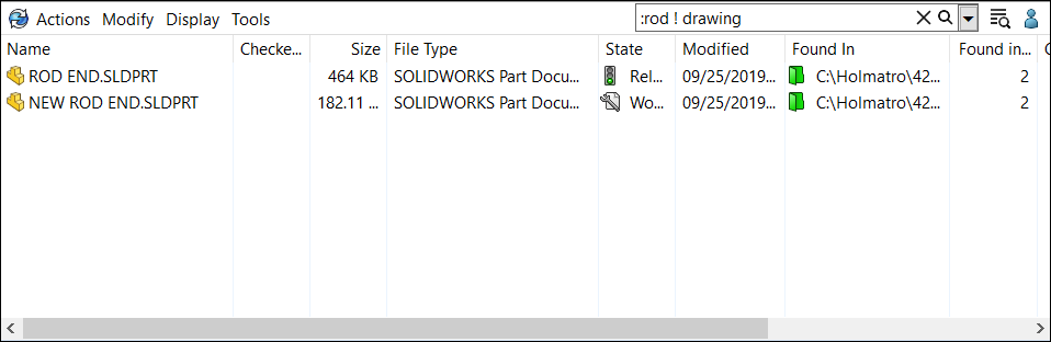 Let’s do a simple search. I want to find all of the drawing files that pertain to any rod part or assembly designs. Here’s one way to do it: