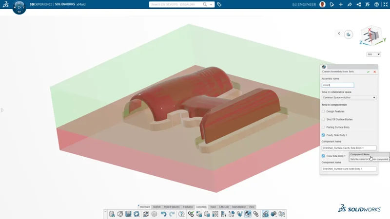 The Create Assembly from Sets command in the Assembly toolbar enables you to create an entire mold assembly from sets. You can also customize the mold assembly and component names as well as select the Collaborative Space you want to save it in from the Create Assembly from Sets toolbox.