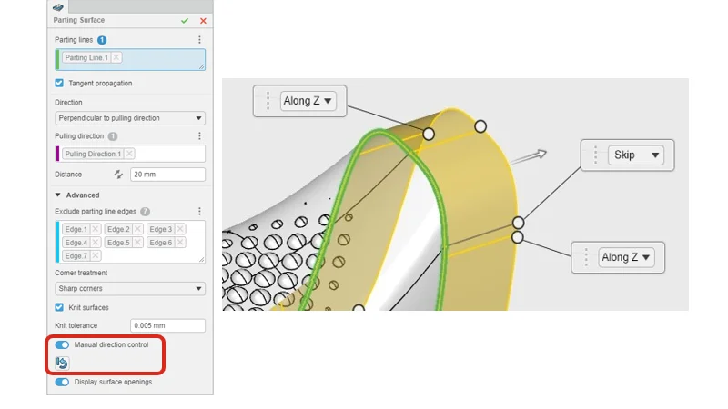 My number-one favorite feature is the ability to use the new “Manual direction control” option, giving you more control than ever of your parting surfaces. You can use it to control the parting surface extension direction relative to a coordinate system or smooth rough areas in your parting surface by automatically blending between adjacent faces. Plus, you can control parting surface extension direction relative to model geometry such as planes and sketch curves.