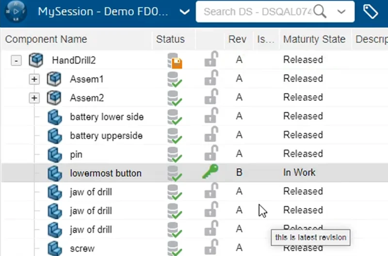The lifecycle commands can also be accessed from the MySession pane. I love the fact that you can perform all lifecycle operations without leaving your SOLIDWORKS session. You can also unpin the MySession pane if you want to use the full space to work on and view your design.