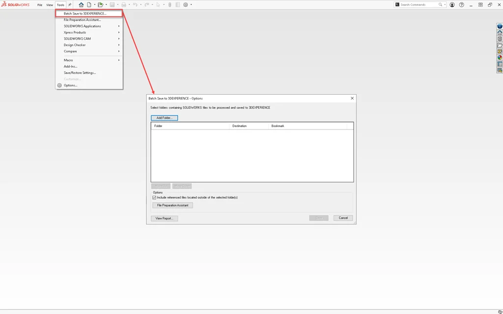 You can easily access the File Preparation Assistant right from SOLIDWORKS from the Tools menu or from the Batch Save to 3DEXPERIENCE dialog.