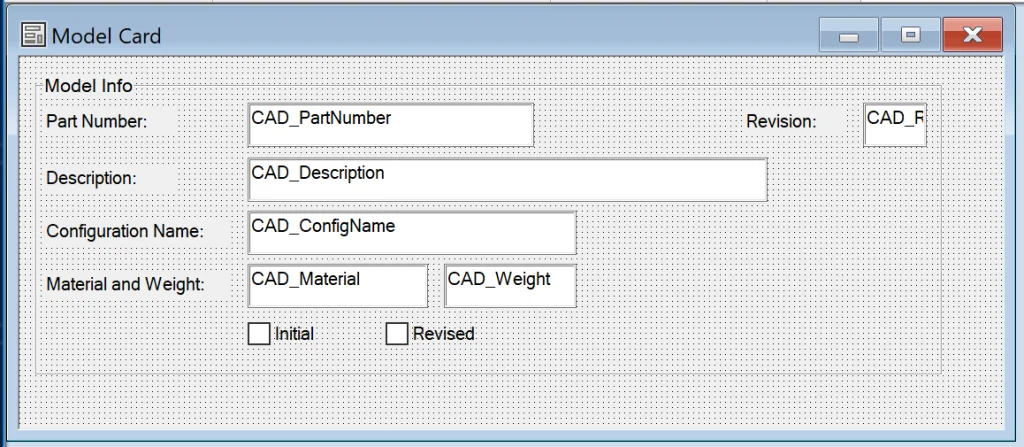 See below for data card example. All variables are mapped to SOLIDWORKS custom properties: