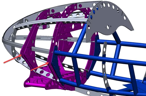 There were no changes to the original front structure. This is a separate assembly made entirely out of aluminum and TIG welded together. The ribs and bulkheads fit together using slots in each member so they are somewhat self-fixturing. Welding fixtures will be needed to hold the ribs and bulkheads together to ensure alignment of the suspension mounting holes through each of the main bulkheads indicated by the red arrows in the image below.