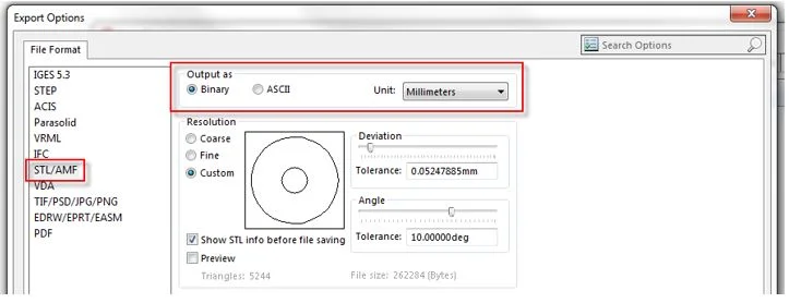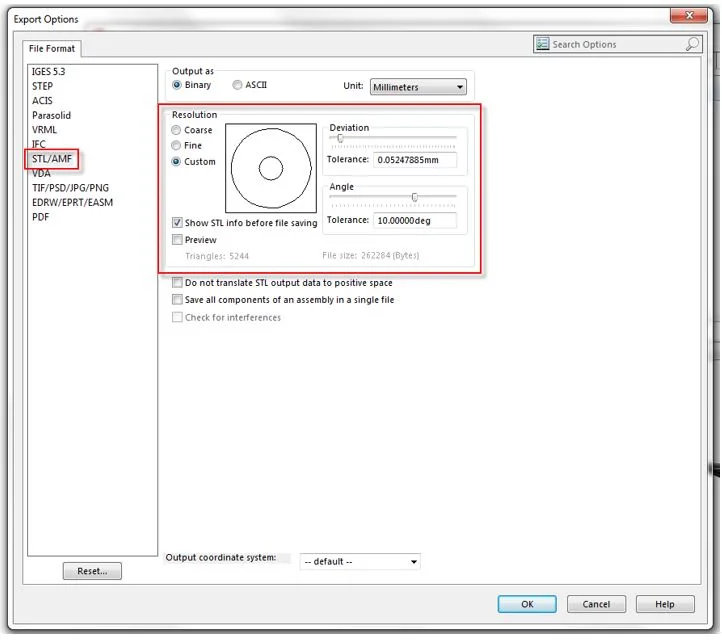 This method of saving a .stl file will generate the file with the default resolution settings. However these settings may not suitable for your printer and could have a negative effect on the quality of your 3D print, so you should consider if you need to make any changes to ensure you have the correct settings.