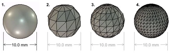 The image below illustrates how different resolution settings can affect the converted model. Taking number 1 as the intended design (SOLIDWORKS model) and number 3 as the best possible resolution 3D printed model. Setting a coarse resolution (Number 2) will mean that the printer, having a finer resolution will be able to physically print the facets, leaving you with an un-accurate model with visible facets. Choosing a very fine resolution (Number 4) means that the file may be overly large, difficult to handle and will almost certainly take longer to process than necessary. Number 3 in this case is the optimal resolution. The settings made in SOLIDWORKS match that of the printer, meaning the best possible 3D printed model and the most efficient in terms of file size, handling and processing.