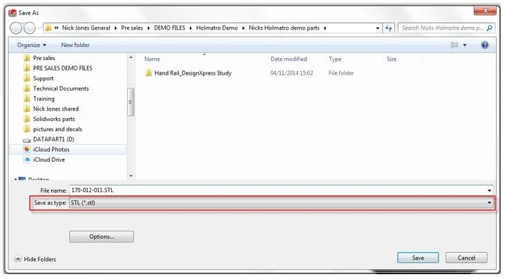 In the save as window, once you’ve selected .stl as the save as type, an options box will become available. Click options to adjust the settings