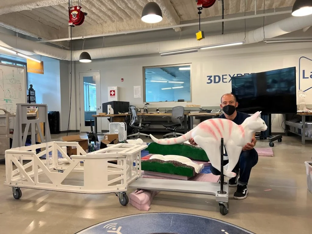 To create The Sled, Rob took two pieces piece of machined wood and stuck pipes in the top and added casters to the bottom. He also successfully entertained the team members and got an arm workout by cutting the pipes himself with a hacksaw. He bored holes into the cats’ bellies so the 3D prints could be placed on the pipes. Finally, he put the printers to work again creating 3D-printed fixtures to hold the cats in place so they wouldn’t spin on the pipes.