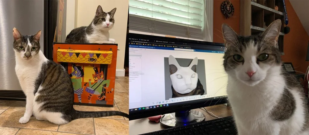 Over the course of two weeks, Rob watched his cats come to life. Once they were all printed and glued together, he could pet the cats, just like Milo and Fonzy at home. They looked almost identical to his own, real-life cats.
