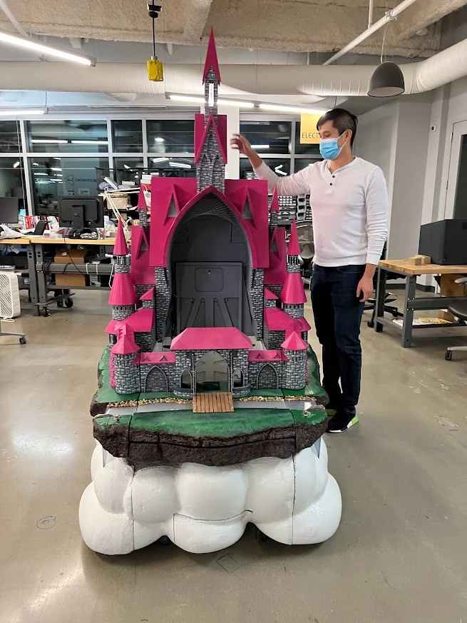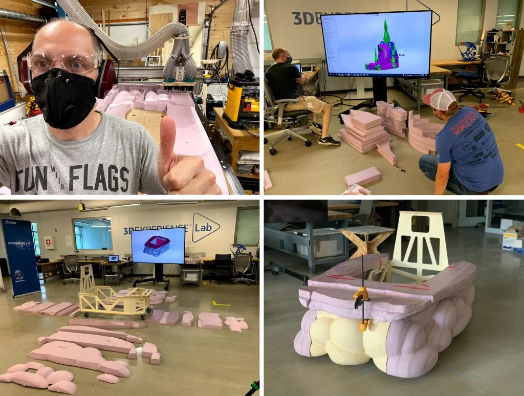 Sal and Albert were able to connect their designs and voila, Freyja’s castle was born! By using3D printing, laser cutting, and cutting foam with a CNC, the pieces of the castle came together. Due to restrictions from the pandemic, Sal ended up cutting the wood for the frame and foam pieces using his own CNC machine in his garage, and then hauled the castle pieces to the office in Waltham. Local team members who felt comfortable being around others using masks went to the 3DEXPERIENCE Lab to start putting the castle together.