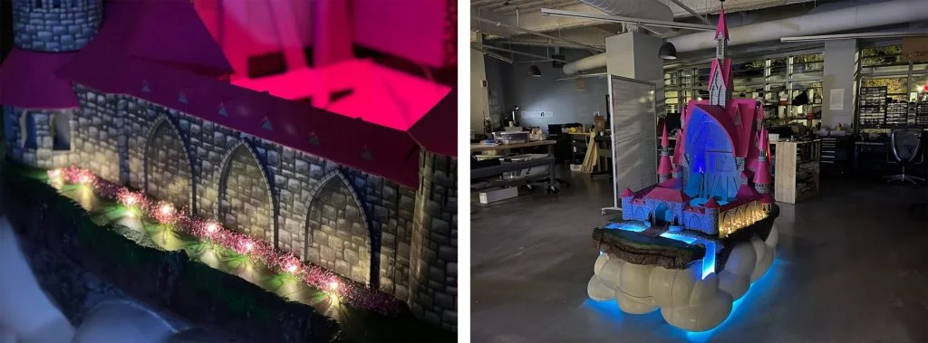 Everyone added their ideas for the costume in the team’s 3D Swym community, and concept artists Chinloo Lama and Jordan Tadic began the design work. Chinloo pulled from Elsa and Anna’s Arendelle’s Castle, and Jordan incorporated ideas from other teammates: adding a curved overhang to shelter Freyja inside the castle; building a drawbridge, which included characters and RFID readers that could control the lights, and so on.
