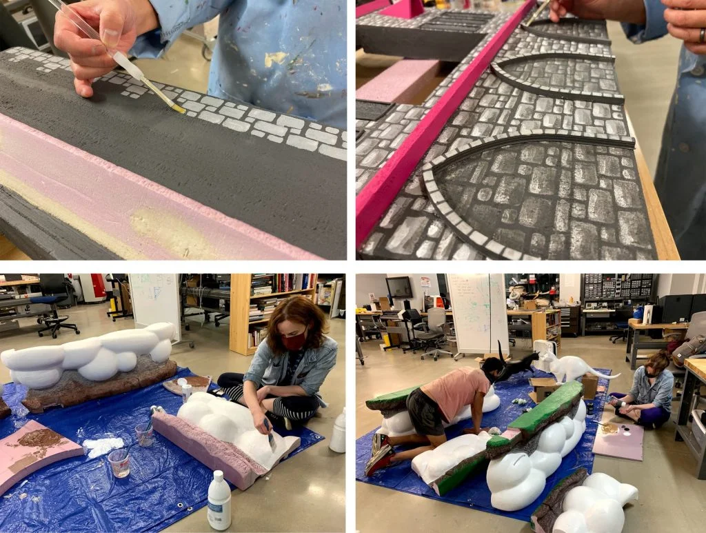 Chinloo then spent hours painstakingly painting on the stones for the castle’s stonewalls. Originally, the team played with 3D textures for the machining process. With so many large pieces, however, Chinloo felt like hand painting would give her more control and allow for less machining time. At first she was going to use a stencil for the stones and only paint them on the lower walls, but come on. This is the SOLIDWORKS Magic Wheelchair team. We always go over the top. Chinloo ended up dressed in a smock and in a zen mode, painting on hundreds (if not thousands) of different stones and then going back to highlight each of them, all over the castle: lower walls, upper walls, turrets, back, and front.