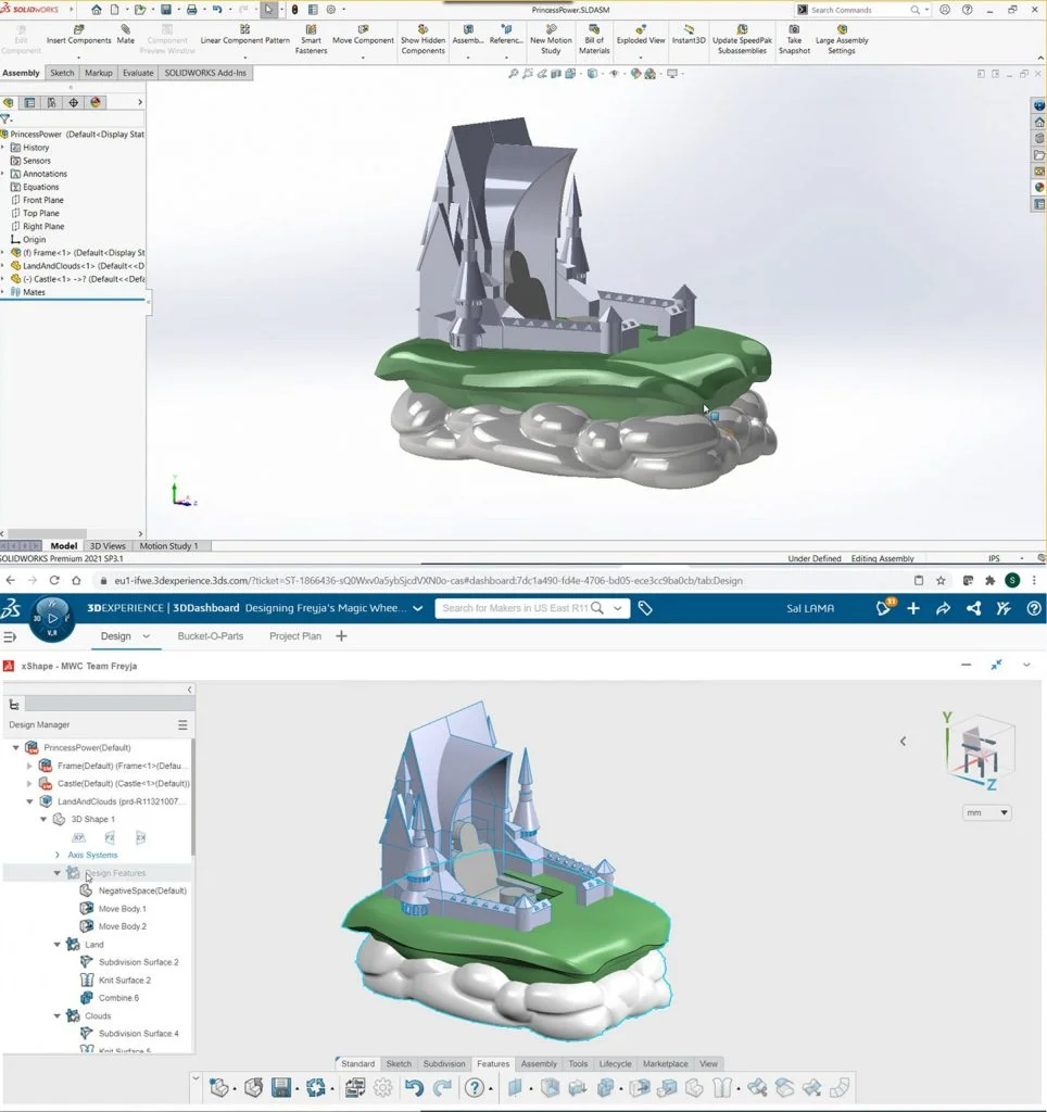 Albert took the wheel in designing the castle itself using Collaborative Designer for SOLIDWORKS. Collaborative Designer for SOLIDWORKS is a role in the 3DEXPERIENCE Works portfolio that connects SOLIDWORKS 3D CAD to the 3DEXPERIENCE platform, allowing for collaboration and both online and local data management.