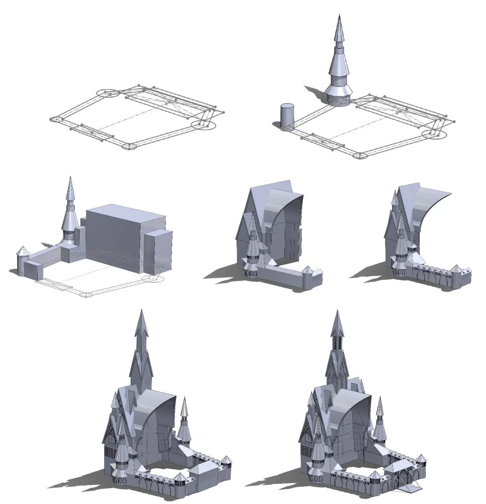 Albert made a base sketch and blocked out different parts of the castle. He began making rudimentary blocks, letting the castle take shape as he got into the details. Then he mirrored the castle to get an idea of how it would look and began working on the upper portions, which he also ended up mirroring. After he got down into the details, he merged all the pieces together and went through the process of slicing the castle, which resulted in 417 bodies.