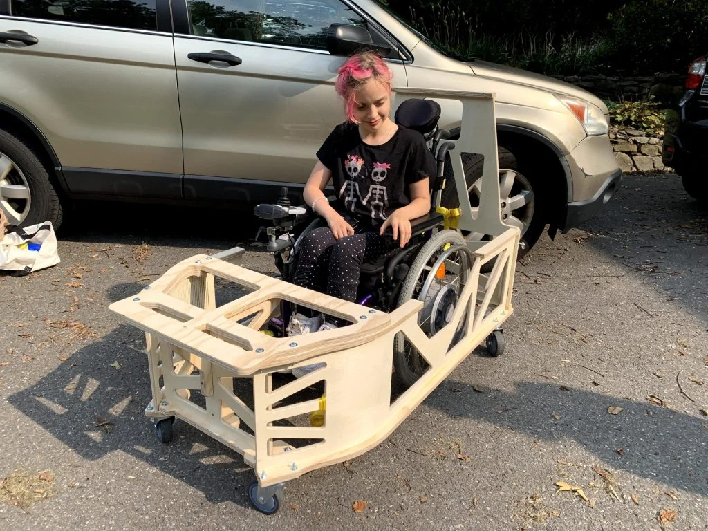 The build team visited Freyja to test the fit of the costume’s frame around her wheelchair. Freyja had a blast with the frame, doing donuts in her driveway with the frame securely attached to her chair. The team had to make some small modifications to the fit, but the edited frame was a huge success.