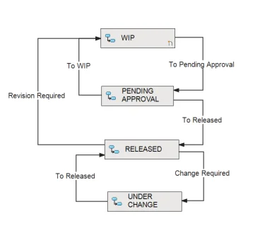 A product data management (PDM) system, such as SOLIDWORKS PDM Standard or Professional, facilitates the process in which models and drawings require a revision or minor change. A workflow as shown above is a pathway for which engineering documents are managed in their life cycle. The blocks, such as WIP (Work in Progress) and Pending Approval, are states and the pathways connecting the states are transitions.
