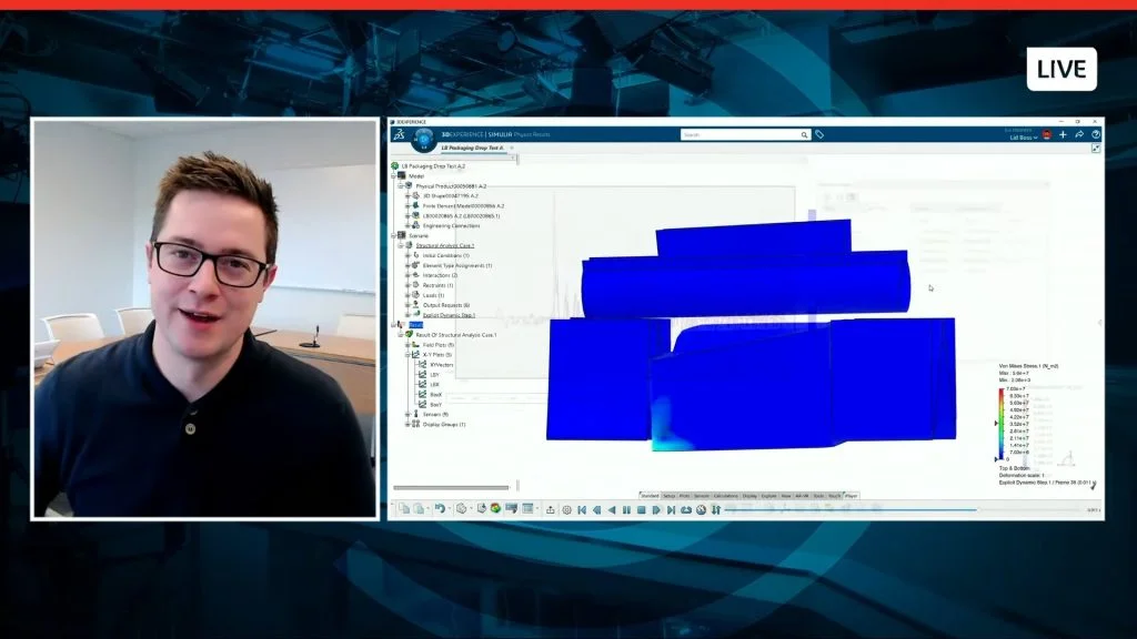 Michael Steeves demonstrates how 3DEXPERIENCE Works Simulation tools can help predict the effects of practical scenarios, such as a package being dropped. Michael also notes that the 3DEXPERIENCE platform updates a model even if material types are changed in SOLIDWORKS designs without any changes or adaptations necessary in the study itself. It just updates!