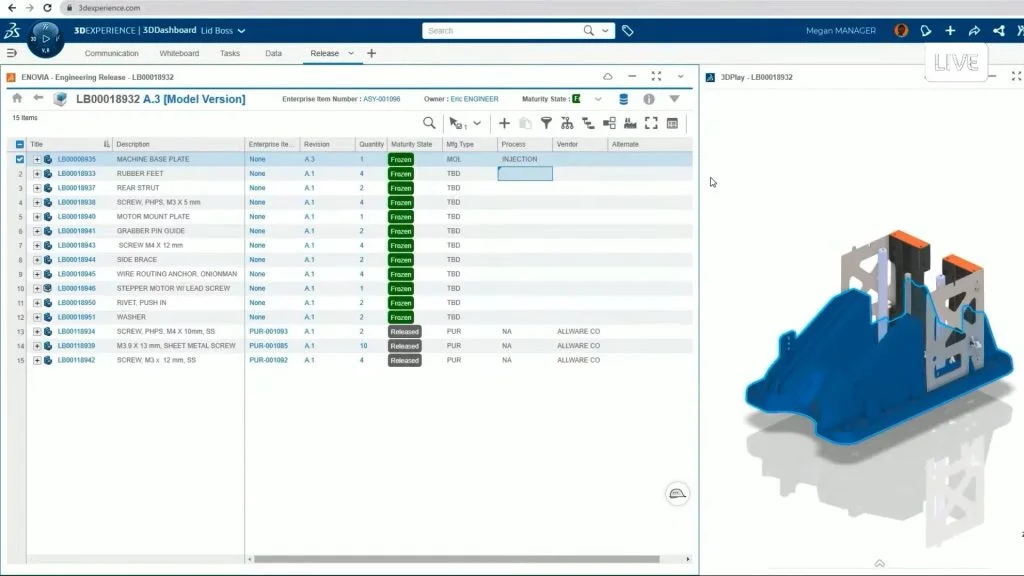We end by discussing the design release and how 3DEXPERIENCE Works can provide a unified view of a product structure by leveraging the Product Release Engineer role. Steve Fick explored how a company like LID Boss could intelligently catalog parts by manufacturing type, vendor, lead time, and more. You can even specify suitable replacement or alternate parts when/where needed.