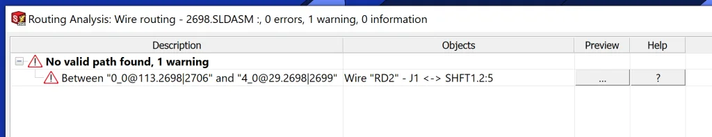 Since the error specifies that No valid path [was] found, I decided to further investigate by going to SOLIDWORKS Electrical > Route Wires and selecting the Draw Graph option at the bottom of the properties dialogue box to get an idea of all possible routes. When we do this, we can see the problem clearly: