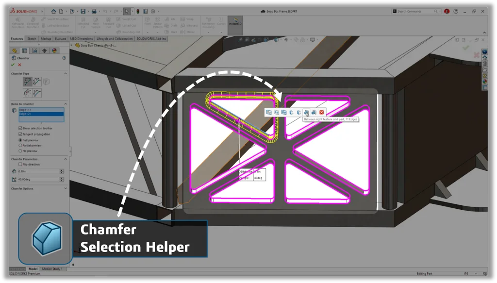 Selecting multiple edges though the intelligent selection wizard has been supported for fillets, and will now be available for chamfer selections as well.