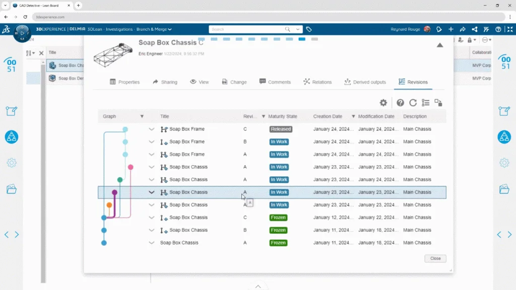 Revision history, along with branches and merges are all recorded. The 3DEXPERIENCE platform allows for comparison of revisions on the fly as well, which illustrates geometric and metadata changes of any revision or branch, and done from a simple drag and drop.