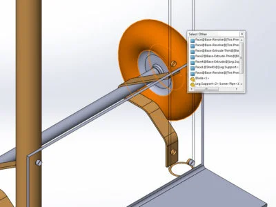 The same can be done for this hand truck assembly example. If we wanted to select the tire of the hand truck, just right-click on the entities blocking the tire and choose the ‘Select Other’ tool. The ‘Select Other’ tool window emerges and the entities that we’d like to choose from can be selected.