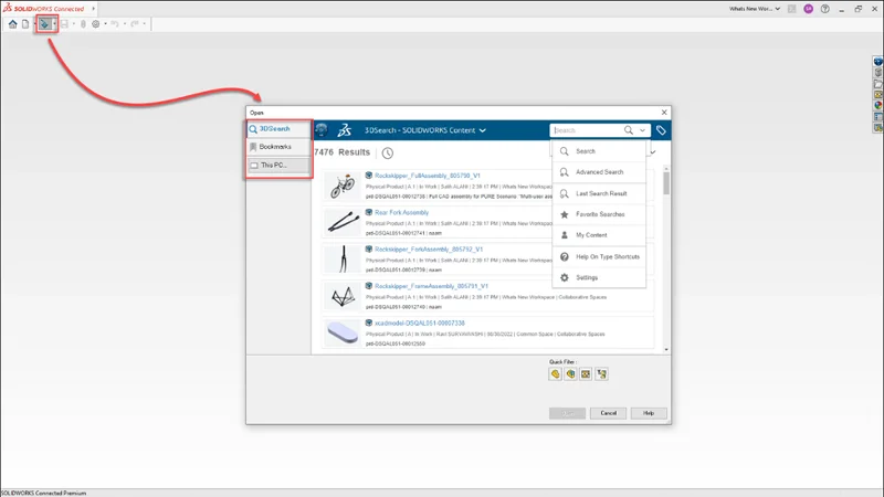 With the new Open dialog box, you can open content from the 3DEXPERIENCE platform with the 3D Search option or access content locally using the PC option. Both options are right at your fingertips in one convenient location so you can get to your content more quickly. You can also access your Bookmarks from this dialog box.