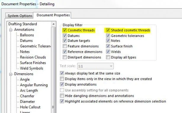 Once a cosmetic thread has been added to the component or assembly using either the “Hole Wizard” or the “Insert annotation” command, it can be displayed by accessing the pull down menu “Tools>Options>Document Properties>Detailing.” They can be shown as either internal (Hole) or external (Cylinder).