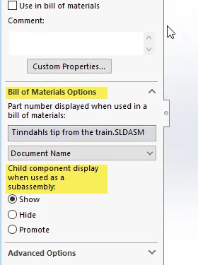 Find “Bill of Materials Options”, and the section “Child component display when used as subassembly.”