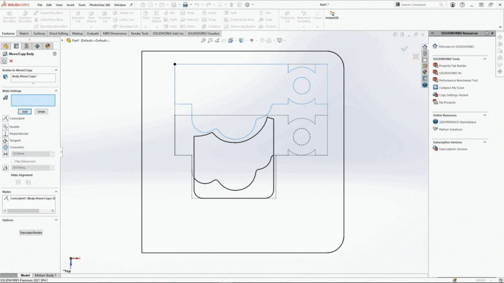 The DXF files were imported into the part layer by layer, the sliding part of the page and each layer were kept as unmerged bodies. The sliding slot is created by copying the sliding part and the moving it as far as it can to be able to sketch out the slot based on the placement of the star and end position of the sliding layers holes. I used move/copy bodies and with constraints selected, I added a mate to the copy of the slider to move it to the maximum height it could slide within the book page. This made it easier to create a slot sketch and cut it out of the page. The slot marks out the maximum boundaries for the sliding element when it is mated with a mechanical slot mate within the assembly.