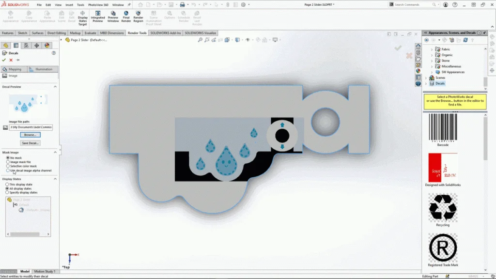 Once I have the page all modelled, I could then save the bodies as 2 new parts, one being the layered page, and the second the sliding part. Once I have the parts saved It is time to add any appearances and decals. The decals are applied using label and projection mapping and parts are resaved ready for assembly. For the sliders decal I used the use decal image alpha channel masking option to remove the black background of my PNG image. When exporting an image for using as decals I do usually opt for the PNG image over JPEG as it is so easy and clean to make in SOLIDWORKS. You will only be able to mask areas that were transparent within your vector software to use this option, otherwise you will need to use selective color or image mask instead. Then under the mapping tab, label mapping was already selected as the best option for this selection, so keeping it on label I could then check the fit width to selection box and the decal enlarged to fit the whole part face.