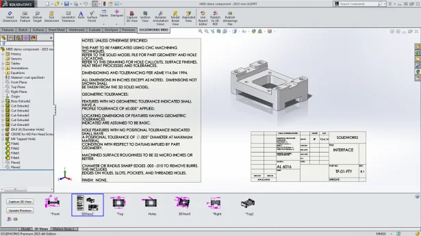 SOLIDWORKS MBD defines 3D PMI such as dimensions, datums, geometric tolerances, surface finishes, welding symbols, bills of material (BOM), callouts, tables, notes, meta-properties, and other annotations within the SOLIDWORKS 3D environment. The process is both intuitive and interactive and helps multiple people within the supply chain understand the design without the need for 2D drawings.