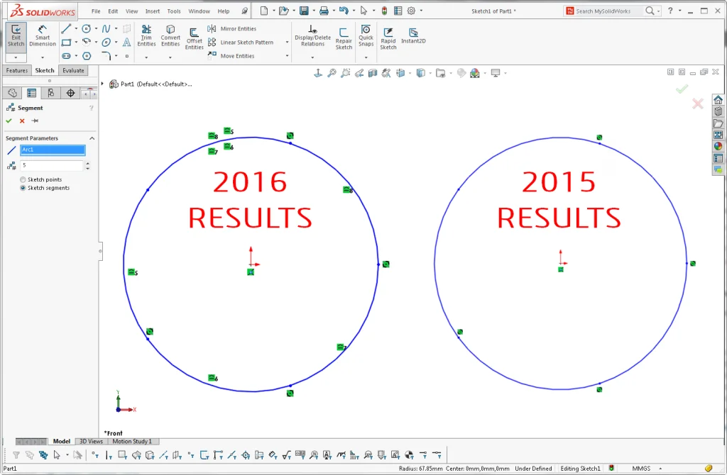 You can use the Segment tool to create equal length segments in arcs and circles. In an open sketch of an arc or circle, click Segment (Sketch toolbar) or Tools >Sketch Tools > Segment. In the PropertyManager, under Segment Parameters, select Sketch segments. When you use the Sketch segments option on arcs or circles, an Equal Length relation is applied to the sketch segments.