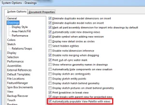 - Setting Tools > Options > System Options > Drawings > ‘Automatically populate View Palette with views’ enabled. (This system option is enabled by default.)