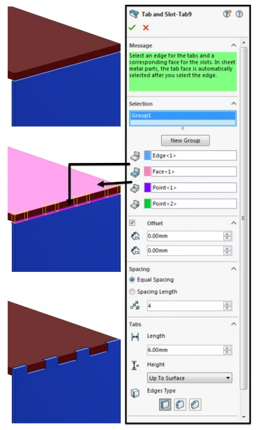As you can see, there is an easy to follow PropertyManager for the Tab and Slot Feature, also showing you a full preview. The flexibility in this tool is also very useful.