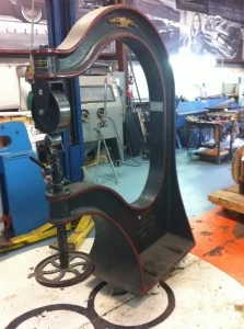 The English Wheel weighs about 2,000 pounds and can handle very large pieces of aluminum or steel, which is necessary if you’re making car body panels. The main components are the “C” shaped frame, the smaller anvil wheel, and the larger rolling wheel. Pressure between the two wheels is controlled by turning the handle below the anvil wheel. Increasing the pressure determines the degree to which the metal will stretch. A piece of metal is “wheeled” between the anvil and rolling wheels and is stretched thus creating a convex surface over the anvil wheel. It takes many passes through the wheels in order to shape the metal to the correct curvature.