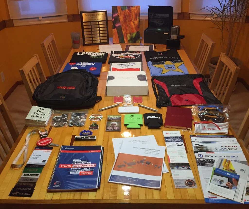 I made little reference booklets to hand out at my presentation and had a lot of SWAG to share with our friends, meaning my suitcase was very full when we headed to LA. I thought this was a good thing because none of that would be coming home, so there would be a lot of extra room for new stuff. Little did I know how much stuff I would be bringing home. We had to run out the night before we left to buy an additional suitcase to get everything home! John Stoltzfus surprised Alin and me with artwork, Kam Smith made a “SWUGLife” t-shirt for me, I received the Michelle Pillers Community Award AND the User Group Leader of the Year Award, I won a 3DConnexion travel kit at the CAD Monkey Dinner, I received a cool desk organizer for being a presenter, and the SWAG . . . lots and lots of SWAG.