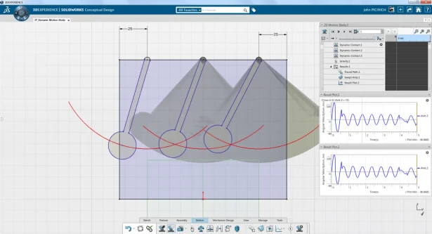 SOLIDWORKS Conceptual Design now provides both kinematic and dynamic analysis capabilities. These expanded capabilities allow you to solve both 2D and 3D motion studies, and test the feasibility of your conceptual designs with minimal effort.