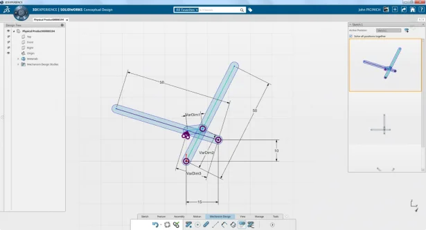 With SOLIDWORKS Conceptual Design you can now design multi-bar linkages easier and faster than ever before. Simply layout the basic configuration of your links, assign the known dimensional parameters, and let SOLIDWORKS Conceptual Design calculate the unknown values.