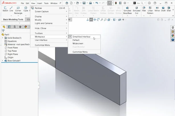 To display the SOLIDWORKS Simplified Interface, Select View from the Main toolbar. Select Workspace. Check Simplified Interface.