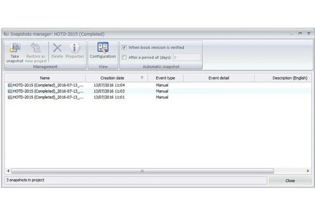 A Snapshot is a project back-up performed at a special time, such as a new revision index creation. The Snapshot offers the possibility to restore an old version of the project; it must not be confused with the project archive.