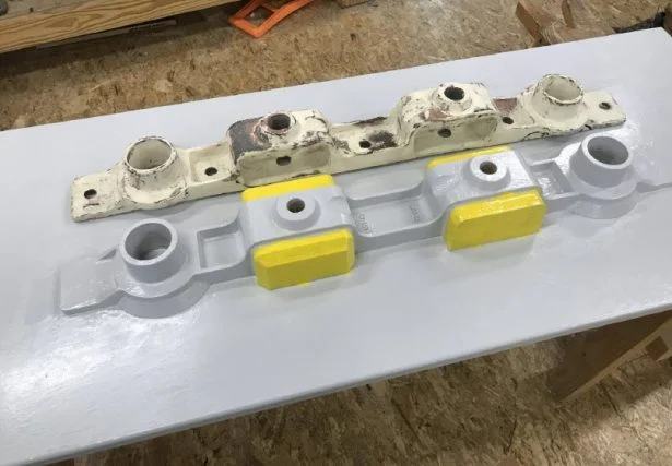 Original components, such as the truck mounting bracket from Car 41, are designed in SOLIDWORKS and then CNC routed.