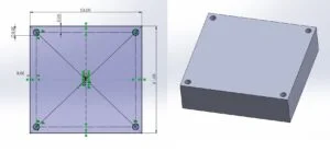 I started by modeling the PCB component, this was a simple rectangle 53mm by 51mm in size extruded 15mm in height. I then sketched the four mounting holes in the initial rectangle sketch meaning that when I extruded this body my holes were already present, no need to go back, resketch and then finally use the cut extrude commend. Two actions completed in one sketch and command!