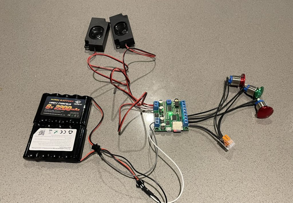 I first had to wire two small 6V battery packs together in series to create the required 12V voltage value needed for the soundboard PCB I was using. The circuit board calls for a voltage between 9 and 24V and as I already had a couple of 6V packs small enough to fit within the housing I elected to wire these to create 12 volts. Once this was done, I wired the speaker module into the output terminal on the control board, this is as simple as wiring the battery in, red wire to positive and black wire to negative. With the lower components now wired I used this stage of the build to add the selected sounds, the design on the circuit board uses a micro-SD card with up to 4 sound files preloaded onto it. It’s a very simple process, essentially drag, drop and rename your 4 chosen files to match the required format.