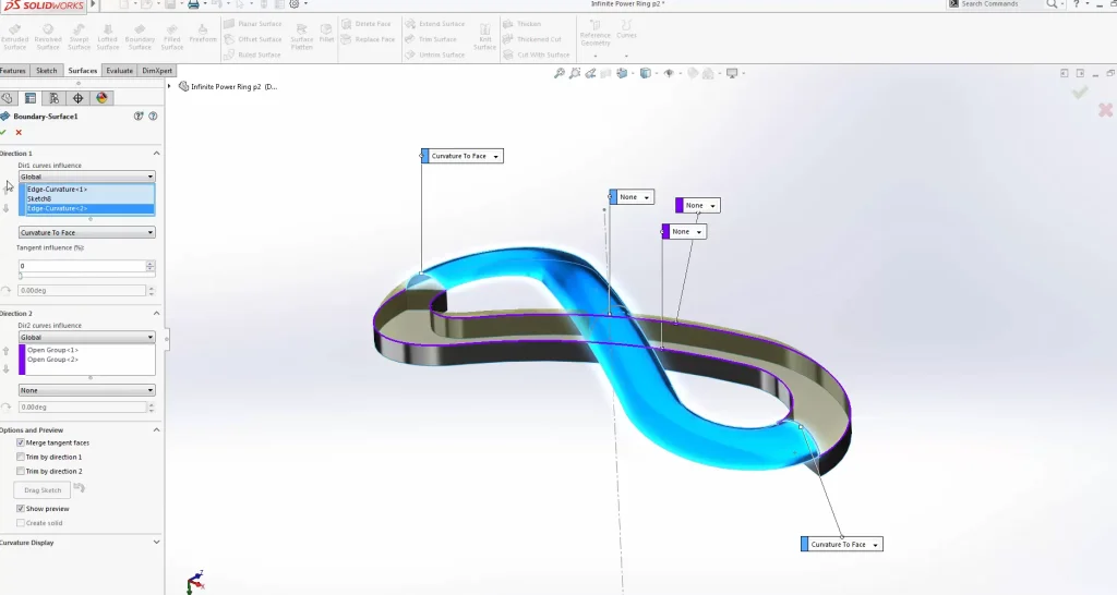 Today, we will continue our four-part series on building this Infinite Power Ring using only surfaces we’ll start building more complex surfaces of the infinity symbol using the Lofted Surface and Boundary Surface features. We will start finalizing this powerful ring by taking a look at the options within the Surface Trim feature.