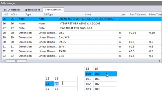 If the user select “Sequence 1,” all new characteristics added will be numbered 100, 101, 102, … If a particular sequence already has characteristics, any new characteristic will be added to the end of the list (103 in this case). If sequences are modified, the balloon numbers will also update accordingly.