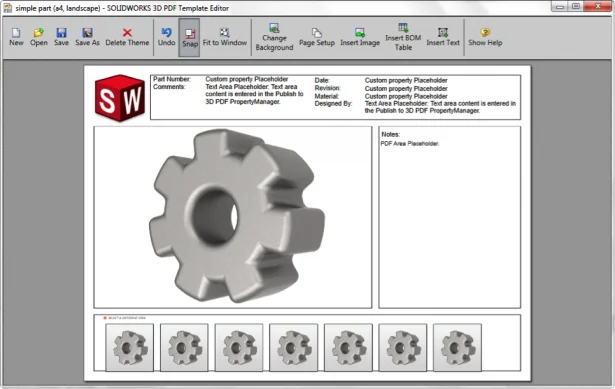 Figure 3.2: eDrawings - Friendly 3D PDF template customization. To further facilitate downstream 3D data consumption, we also provide a 3D PDF template editor to tailor 3D PDF for multiple use cases or different teams, such as 3D PDF for part or assembly, Request for Quote, or machine part templates for remote shops. We can easily insert company logos or map product meta-properties into 3D PDF.